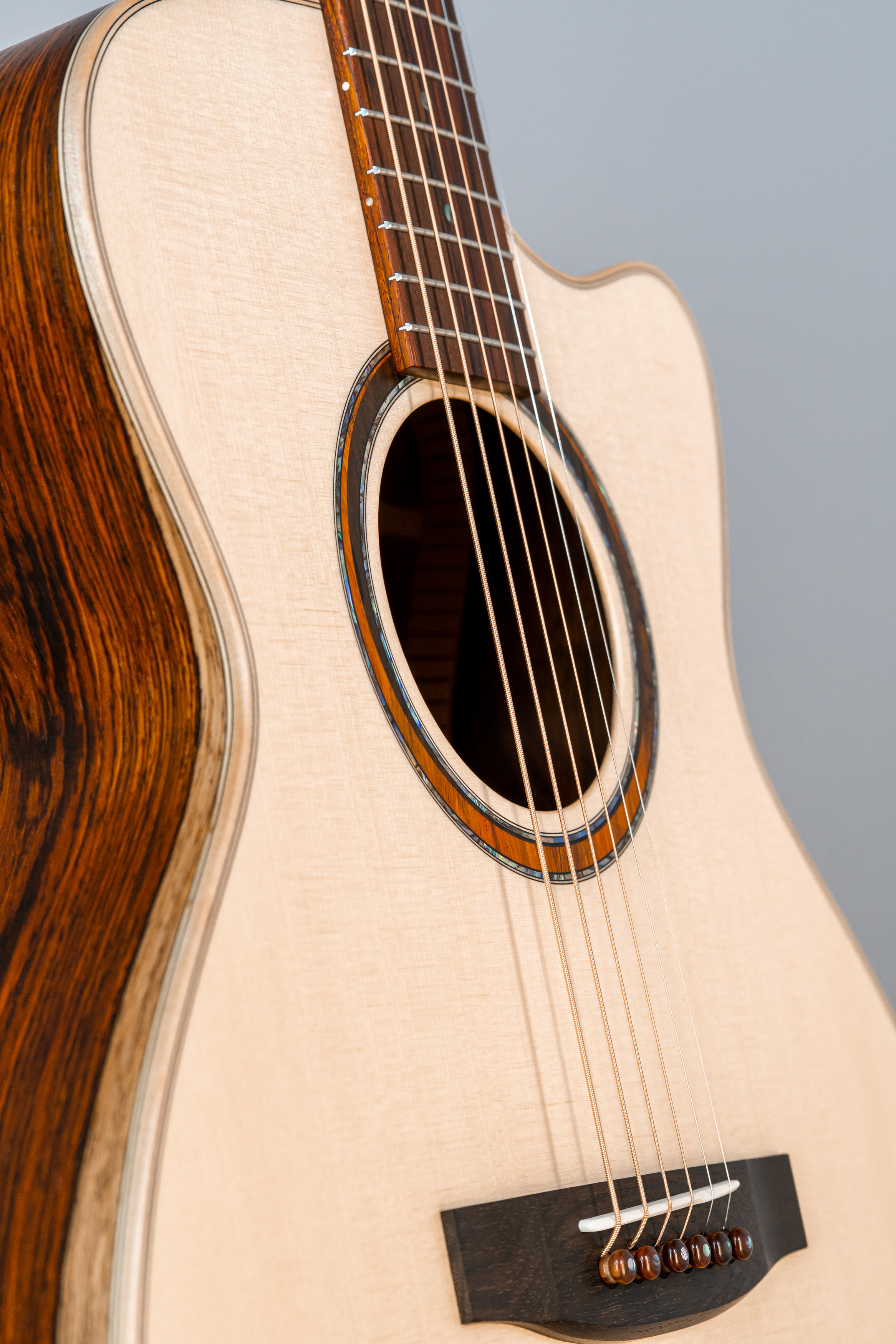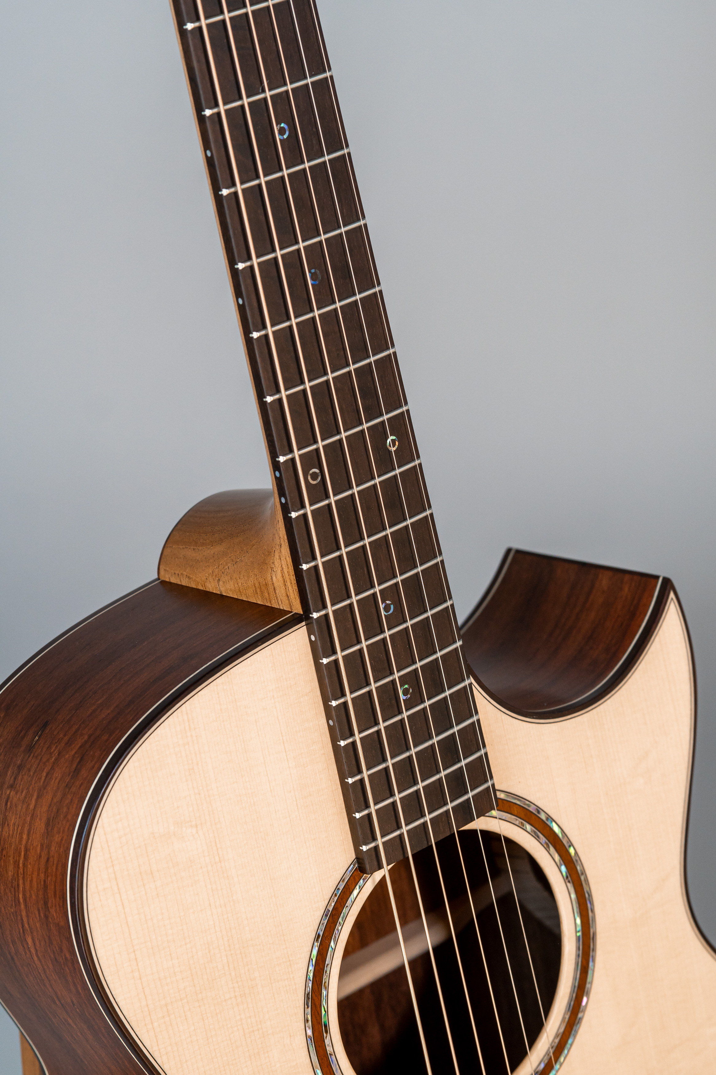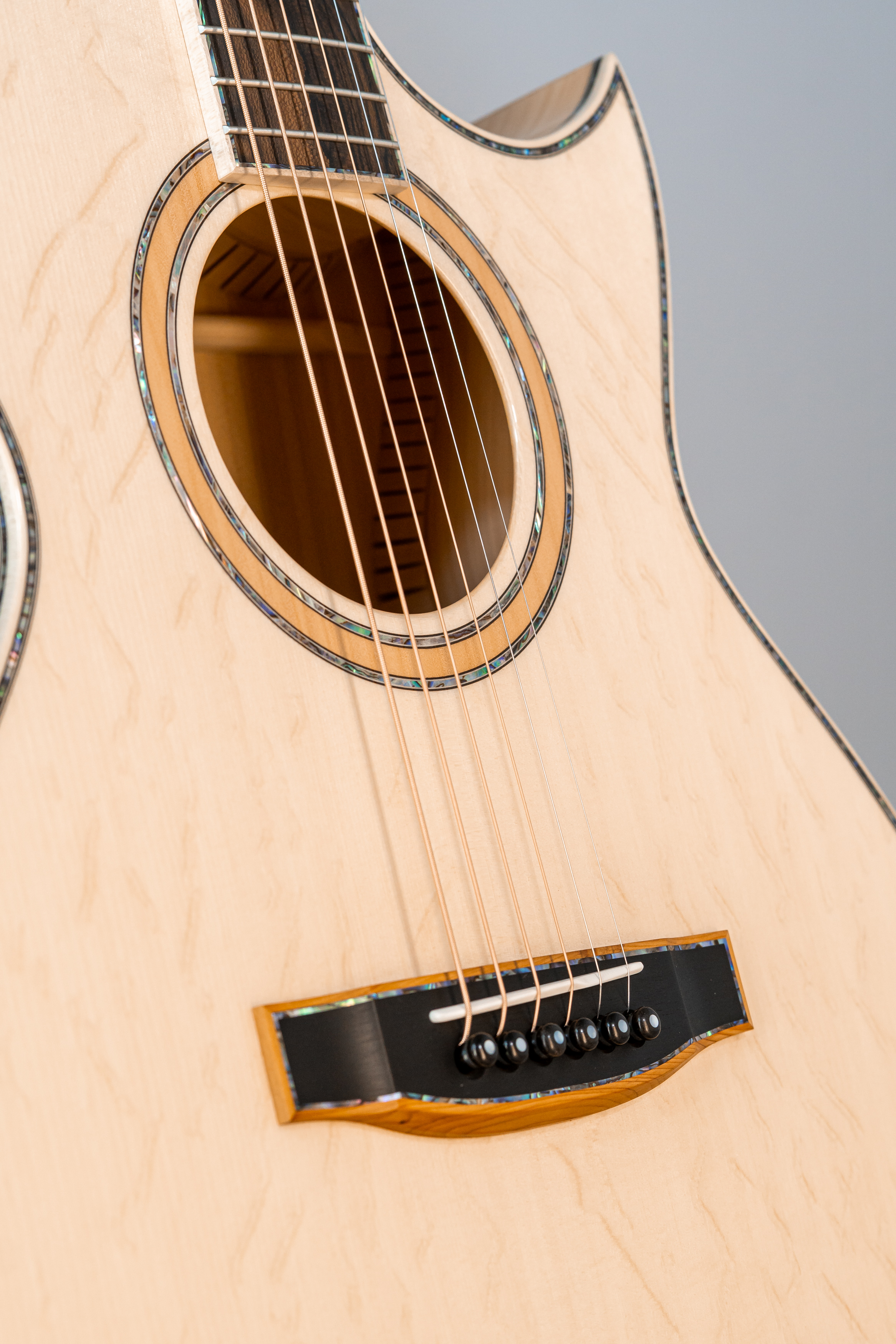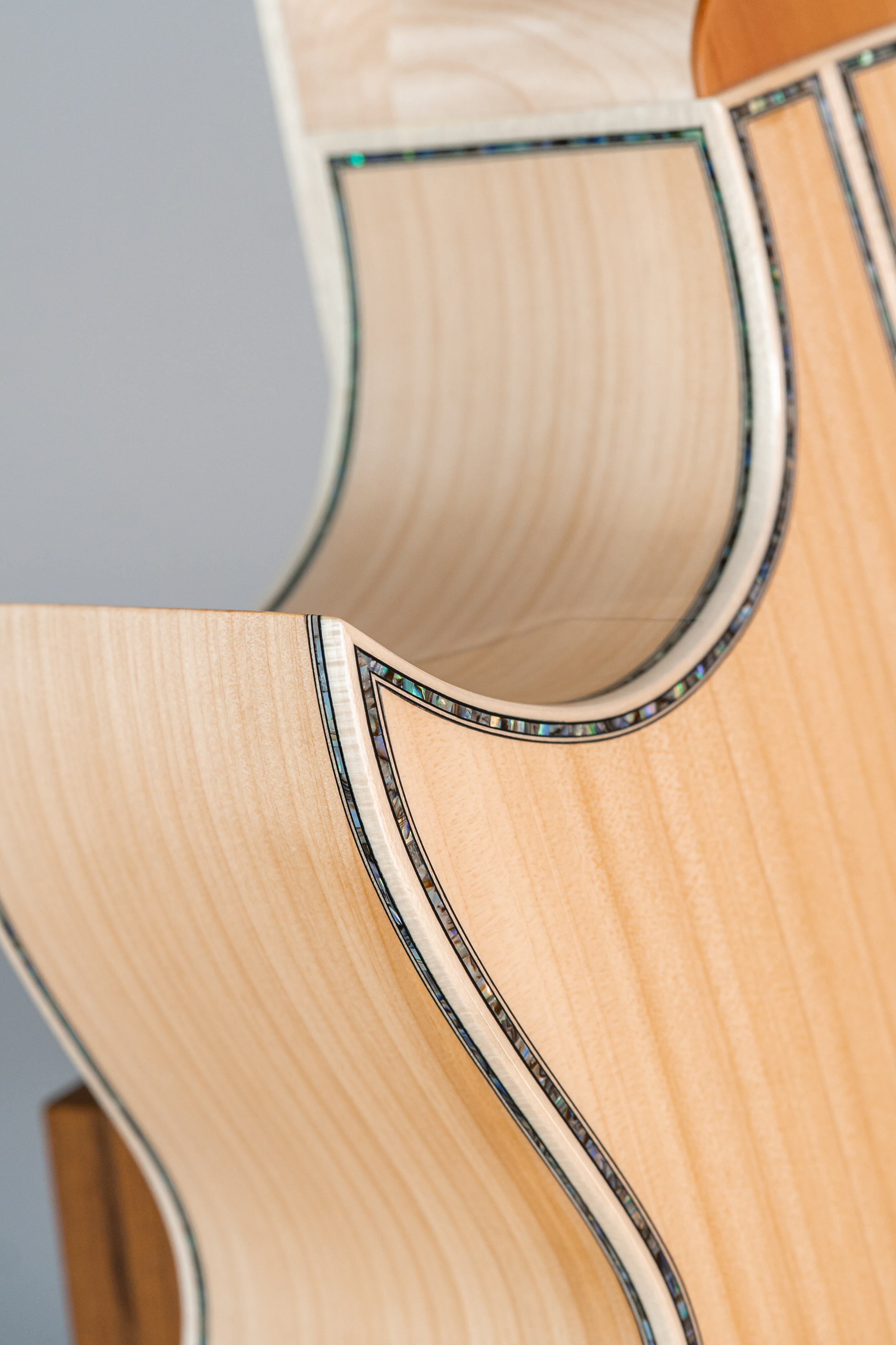 - Margini tavola, fondo e fasce intarsiati in abalone, cutaway